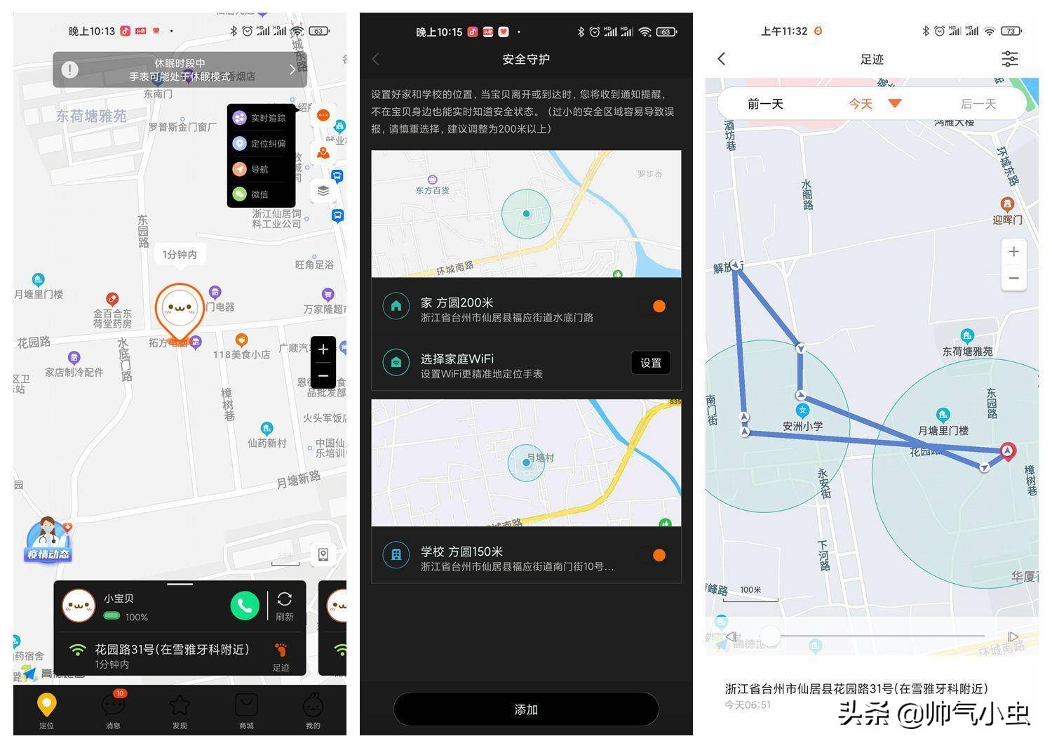 另外,安全守护(电子栏栅)功能大家应该也非常熟悉了吧!设置家、学校的位置之后,宝贝离开或者达到,手机端都会收到信息。